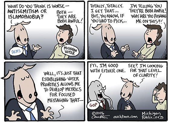 We live in difficult, challenging times. Our nation is again at war. (Wait. What’s that? Oh, sorry: Our nation is again at major combat operations.) Closer to home, Michigan faces continued economic uncertainties. Affordability is a growing crisis. Reading scores for our children are abysmal. The calendar tells us winter is almost over, but we all know it isn’t.