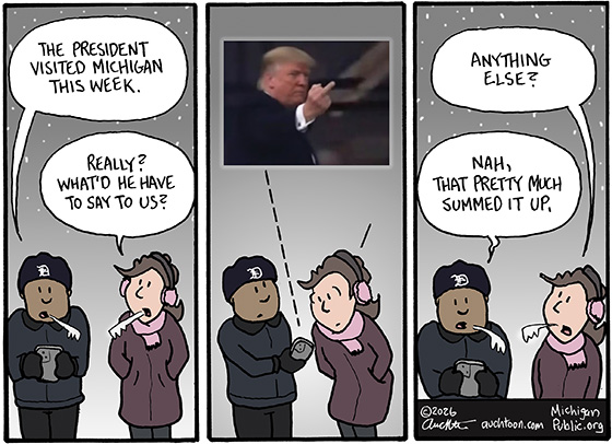 Trump did then go on to speak words out loud at the Detroit Economic Club. But it was the usual salad of lies, hyperbole, and petty grievances. Words that, as always, were about him, not us. So we can safely conclude that he really only had one message specifically for a Michigander.