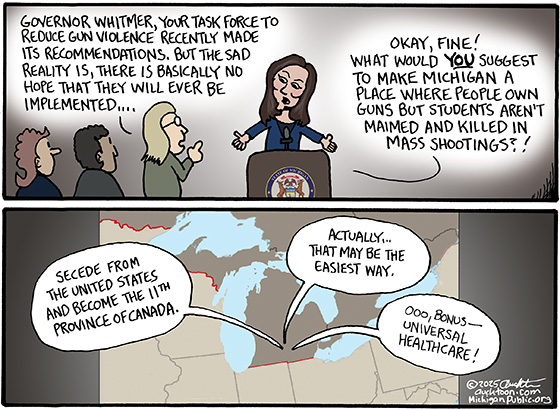 Let me be clear: doing nothing is still the worst option. So I will continue to applaud and support efforts to reduce gun violence. But cynically speaking, joining Canada may just be the best option for Michigan.